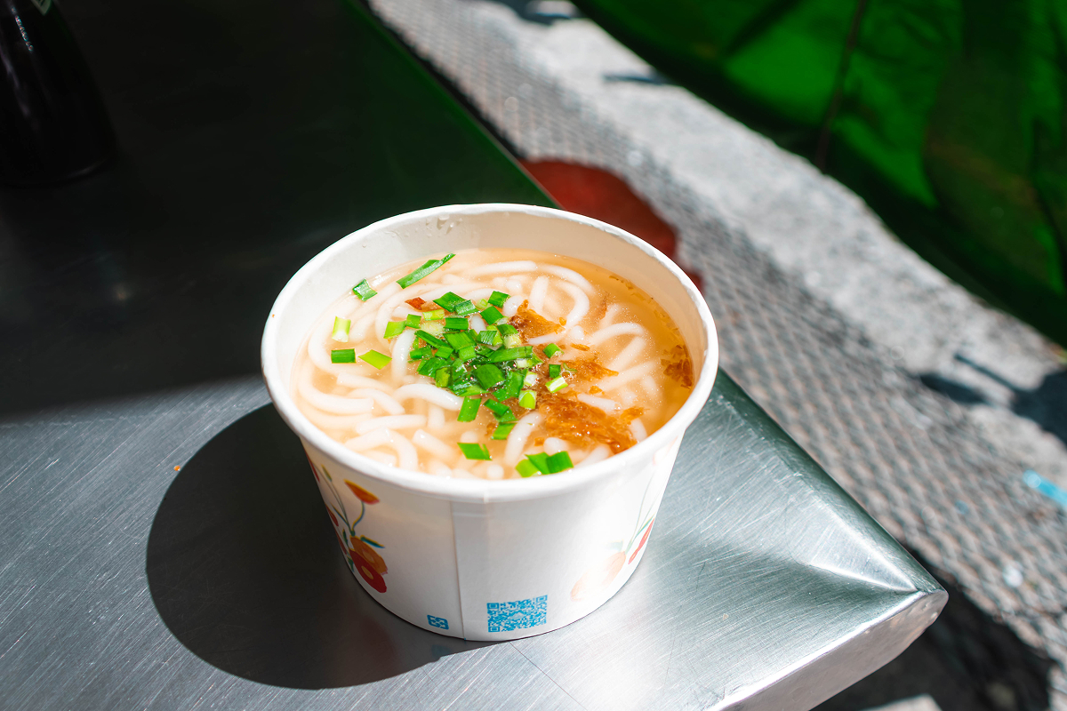 —— 滑嫩彈牙的米苔目搭配清甜豚骨湯,佐以紅蔥酥與芹菜末,滿溢古早味,還有宜蘭特有的粉腸,吃一口就讓人想回到童年。